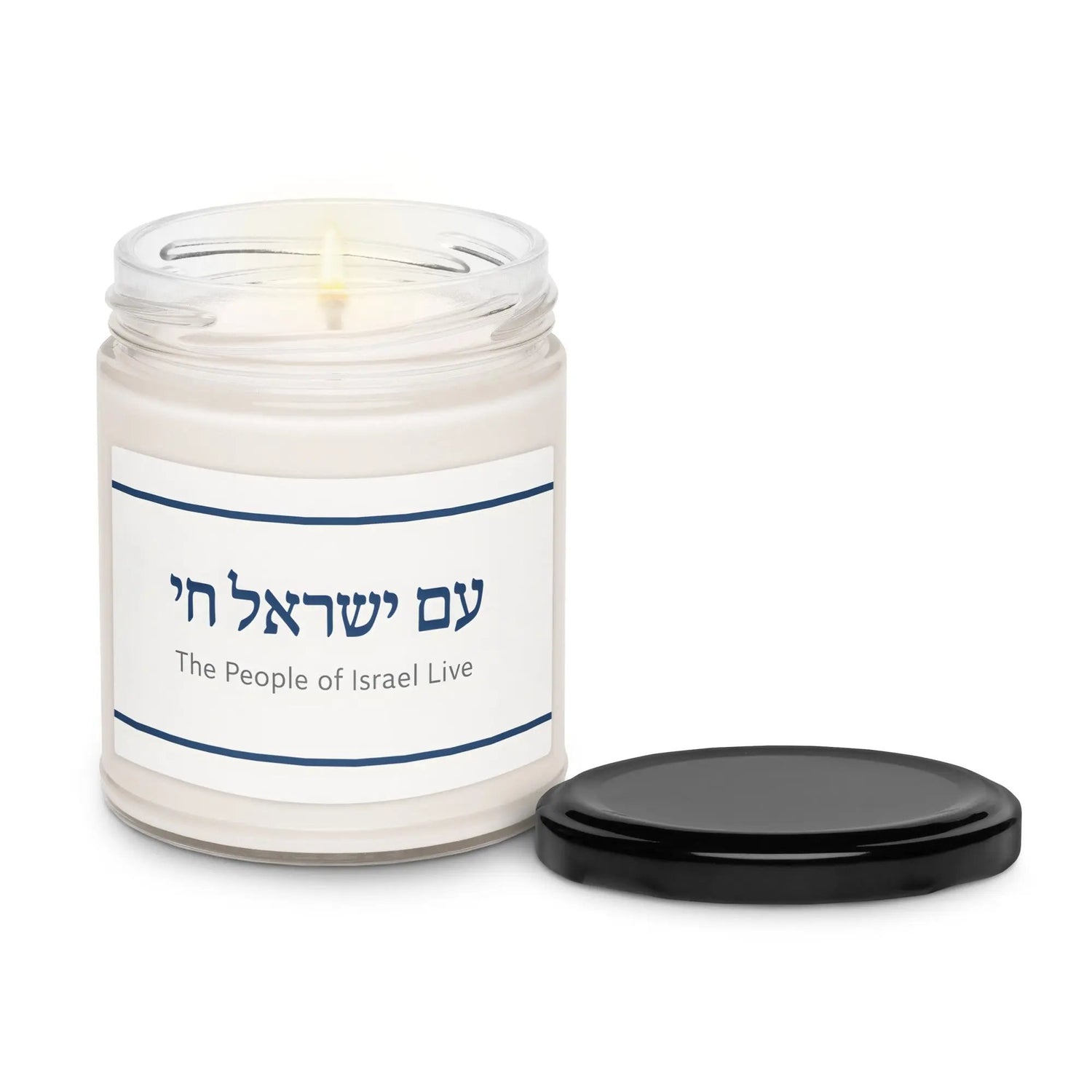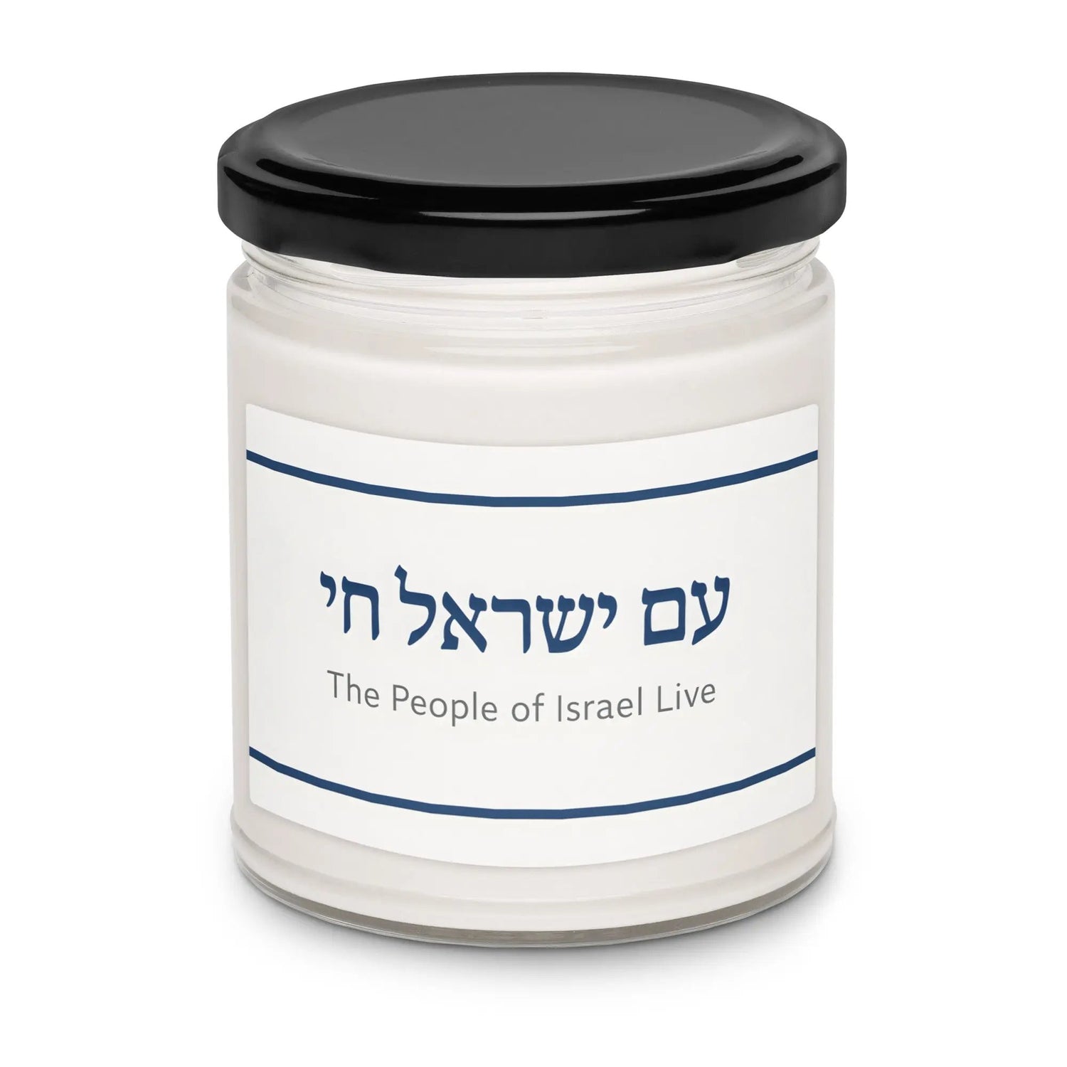 Celebrate the unshakable spirit of Israel with our bold and meaningful Am Yisrael Chai candle, a declaration that “The People of Israel Live.” This candle features the iconic Hebrew phrase "עם ישראל חי" alongside its English translation, printed on a clean, modern label framed in deep blue.