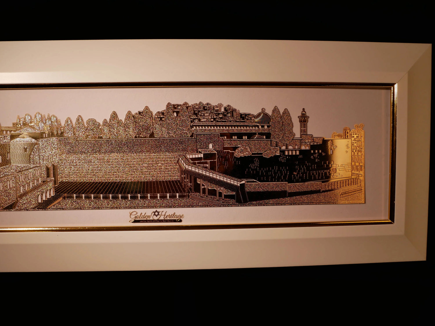 Every ancient wall, gate, and iconic skyline is expertly etched in radiant gold, with the Western Wall (Kotel) replicated in exact detail, giving the artwork an authentic, sacred presence. Set against soft, luxurious velvet — available in white or black — the shimmering gold creates depth and contrast, evoking the city’s spiritual resonance.