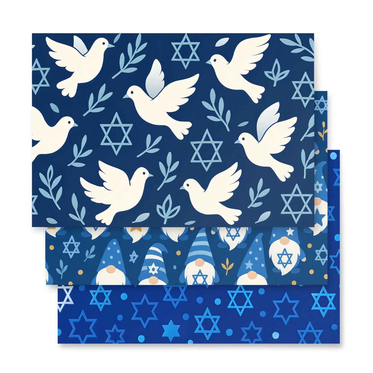 Each sheet in this Hanukkah Christmas Star of David gift wrapping paper set tells a visual story of peace, joy, and covenant — combining the powerful Star of David with olive branches, cheerful Hanukkah gnomes, and celebratory patterns.