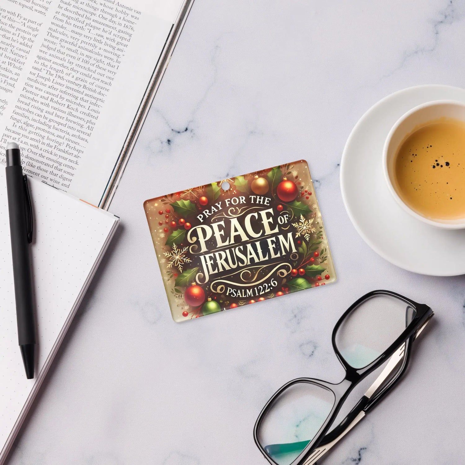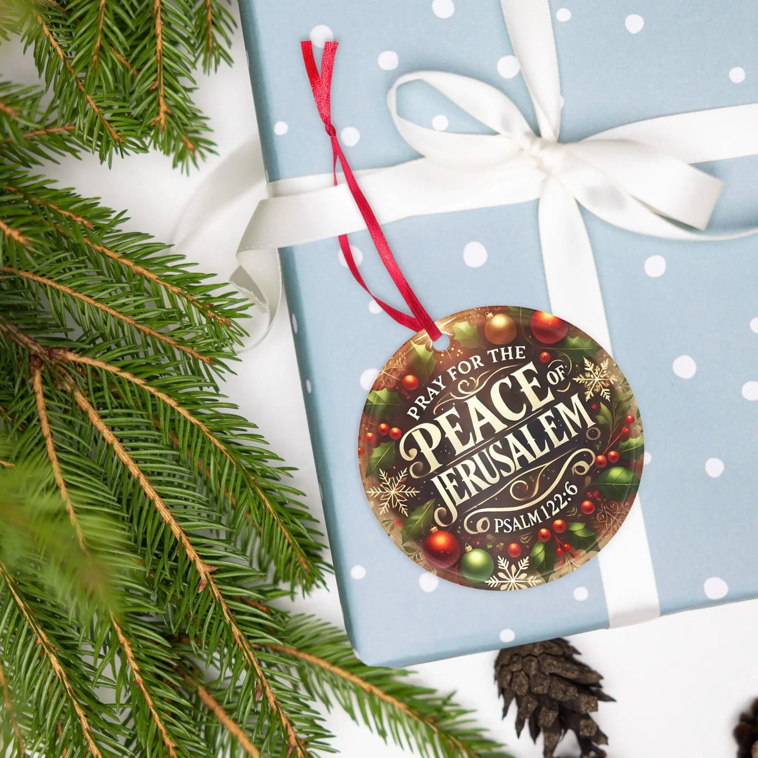 Celebrate the true spirit of the season with our Pray for the Peace of Jerusalem Ornament. Featuring the timeless verse from Psalm 122:6, “Pray for the Peace of Jerusalem,” this ornament is beautifully designed with festive holly, snowflakes, and vibrant Christmas baubles. This heartfelt decoration is a meaningful reminder of faith, prayer, and the hope for peace in the Holy City.
