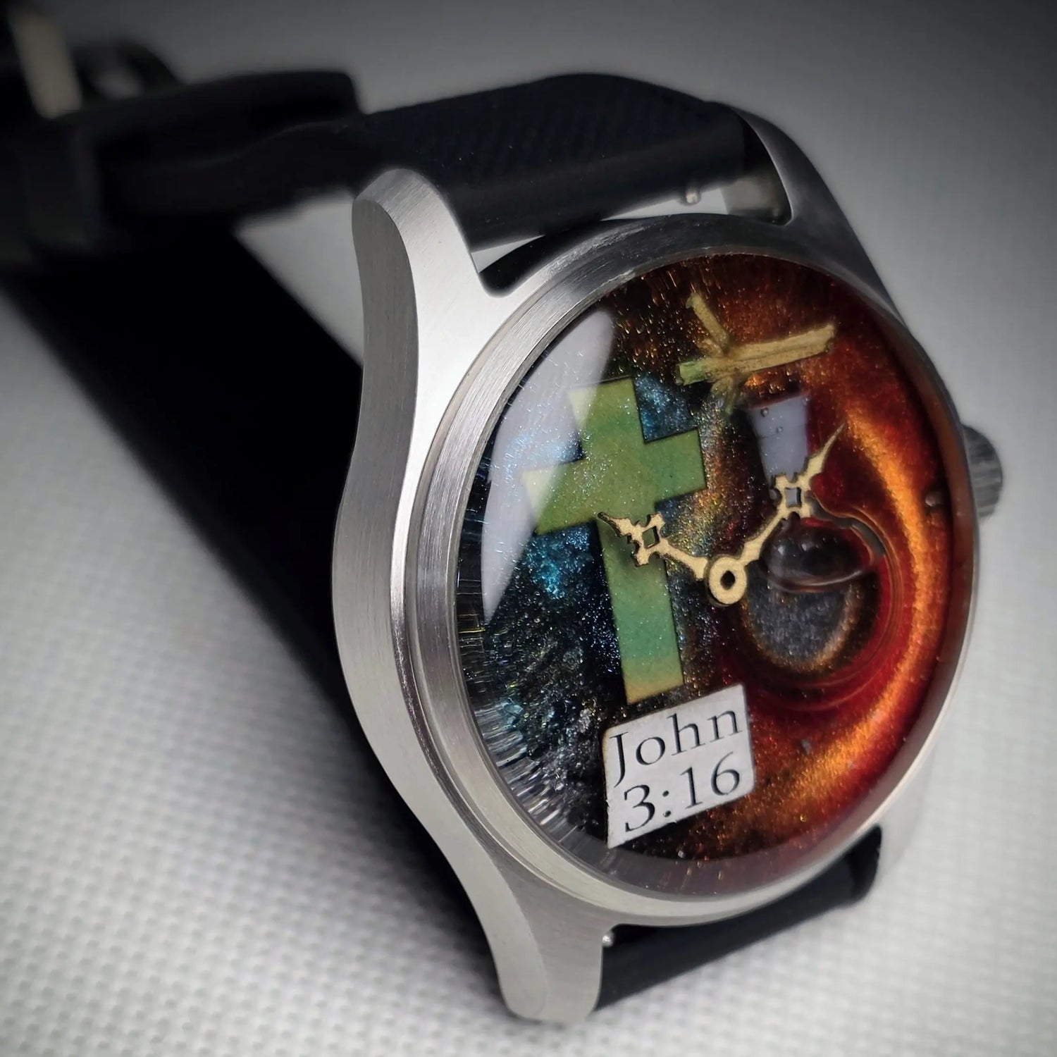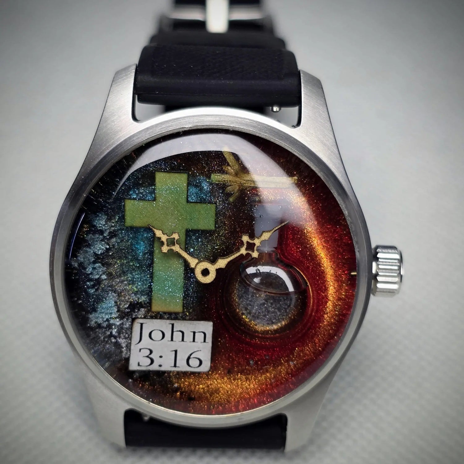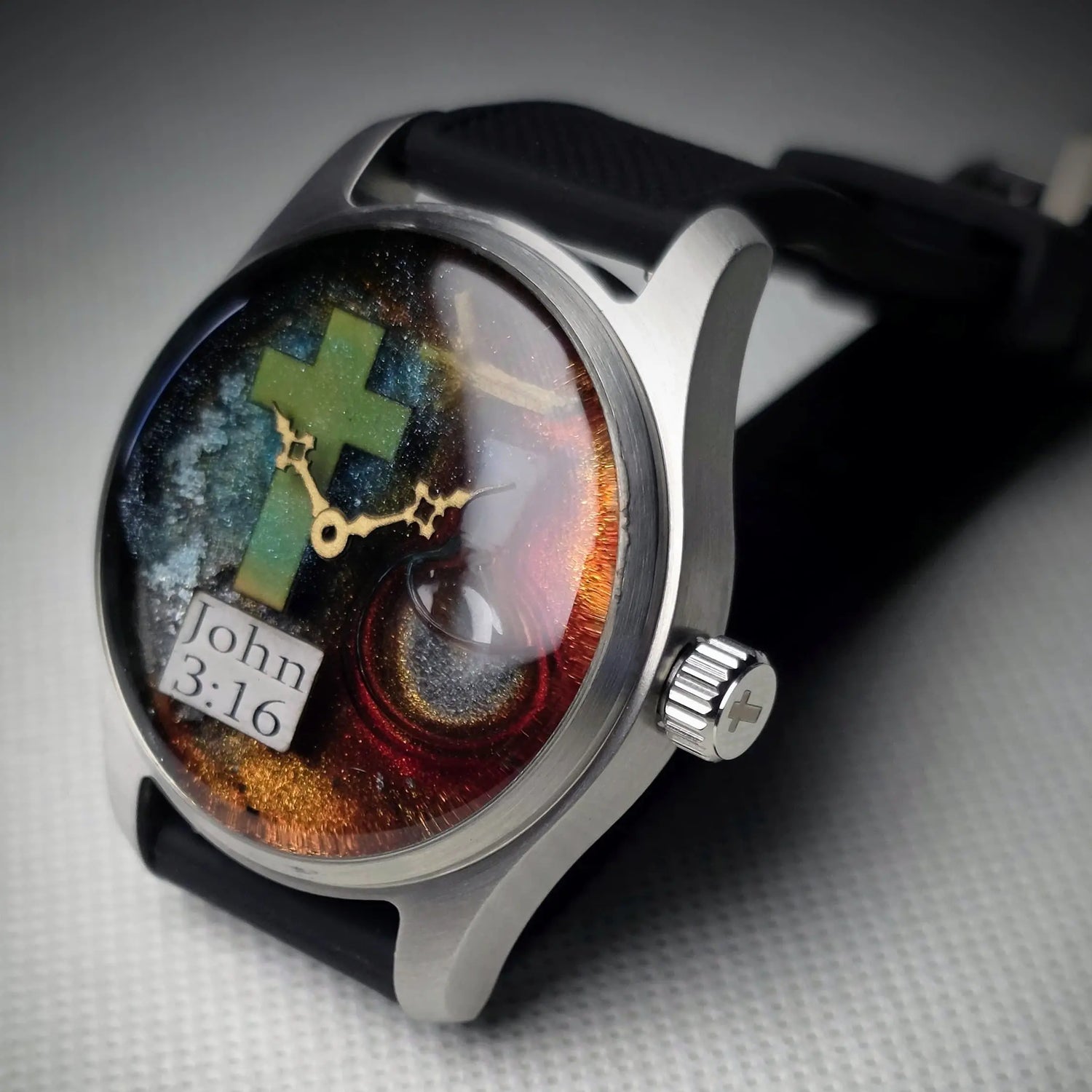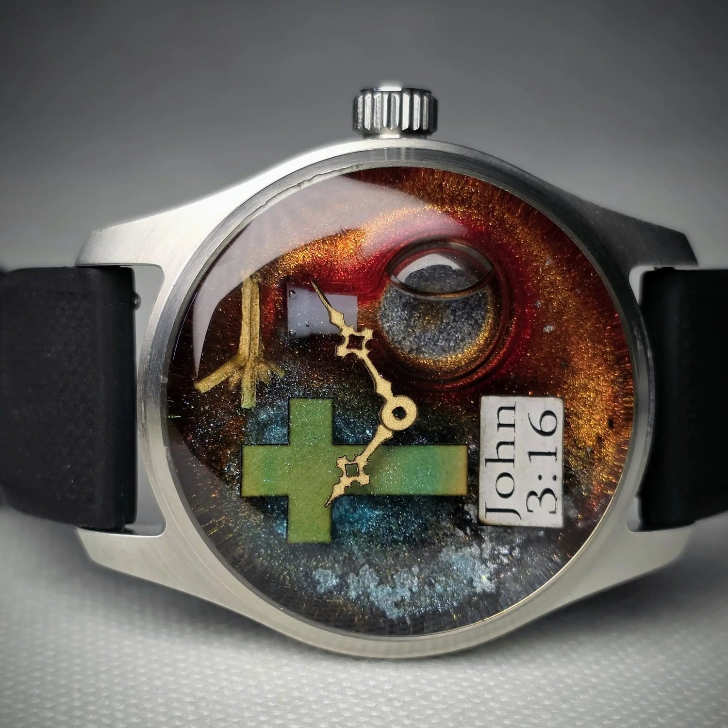 This is an art watch. It is not meant to tell time, but to tell the story of faith.